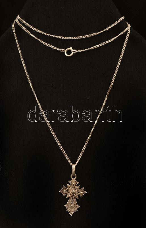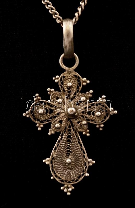 Ezüst nyaklánc, antik filigrán feszülettel, Ag., nettó: 8gr., a nyaklánc jelzett, 80cm / Silver necklace with antique filigree crucifix, Ag, net. 8gr,the necklace marked, 80cm