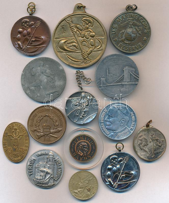 14db-os vegyes díjérem, emlékérem tétel, sportérem tétel, közte 1935. "Bethlen Gábor Polgári Lövészegyesület" fém plakett (41mm) + "Vám- és Pénzügyőrség 25" Cu emlékérem (24x37mm) T:2