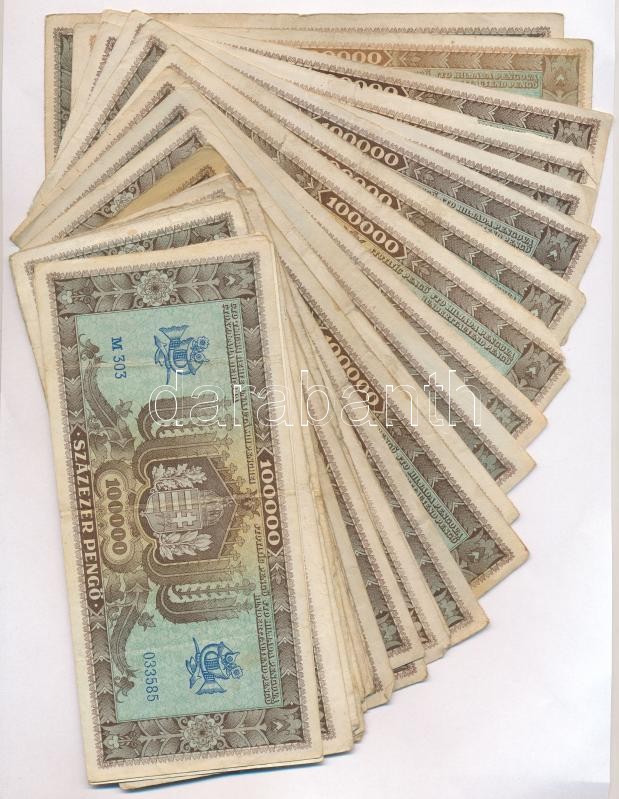 1945. 100.000P (30x) T:III,III- https://www.darabanth.com/de/274-Fernauktion/274.0/Numismatik/Ungarische-Banknoten~200011/1945-100000P-30x-TIII-III-~II1398051