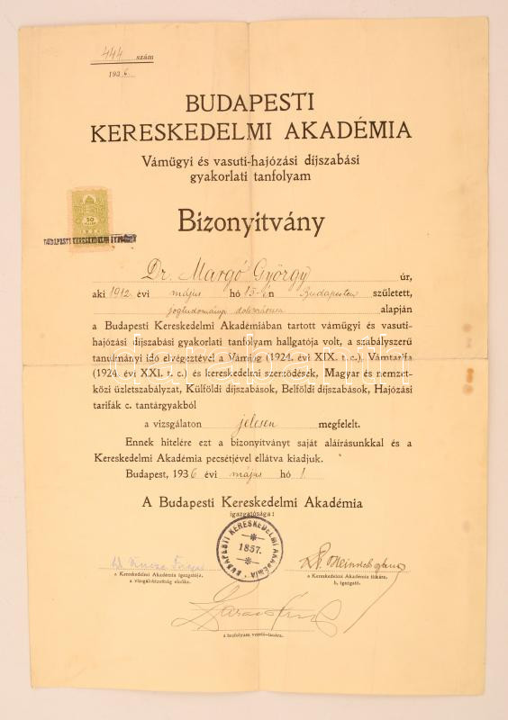 1936 a Budapesti Kereskedelmi Akadémia bizonyítványa vámügyi és vasúti-hajózási díjszabási gyakorlati tanfolyamot végzett hallgató részére, okmánybélyeggel