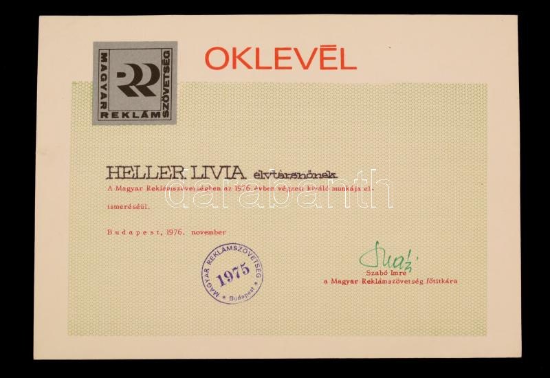 1976 a Magyar Reklámszövetség elismerő oklevele munkatársa részére https://www.darabanth.com/de/275-Fernauktion/275.0/Andere-Sammelgebiete/Dokument~200238/1976-a-Magyar-Reklamszovetseg-elismero-oklevele-munkatarsa-reszere~II1403533