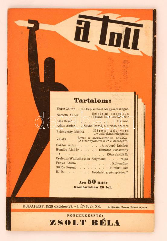 1929 A Toll Irodalmi és kritikai hetilap. Főszerkesztő Zsolt Béla. Kis példányszámú értelmiségi hetilap, benne Szász Zoltán, Németh Andor, Belényessy Miklós, Komlós Aladár, és mások írásaival. A borító Berény Róbert munkája. Budapest, 1929. október 27., I. évfolyam, 28. szám, 42 p. Kiadói tűzött papírkötésben. Szép állapotban.
