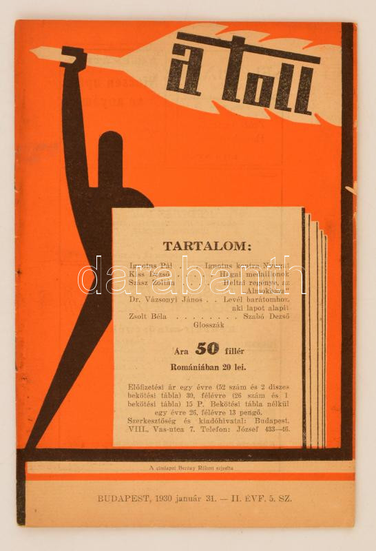 1930 A Toll Irodalmi és kritikai hetilap. Főszerkesztő Zsolt Béla. Kis példányszámú értelmiségi hetilap, benne Ignotus Pál, Szász Zoltán, Zsolt Béla, és mások írásaival. A borító Berény Róbert munkája. Budapest, 1930. január 31., II. évfolyam, 5. szám, 22 p. Kiadói tűzött picit foltos papírkötésben.