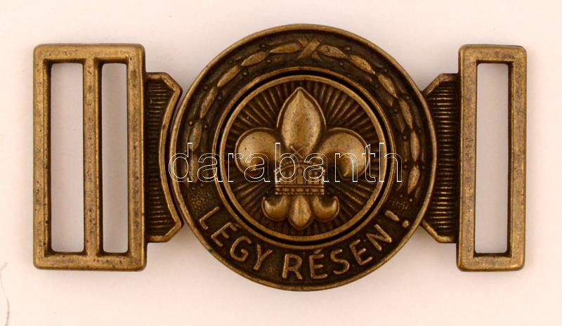 Beschreibung: cca 1930-1940 "Légy résen" feliratú, koronás, réz cserkész övcsat, 10x5 cm.