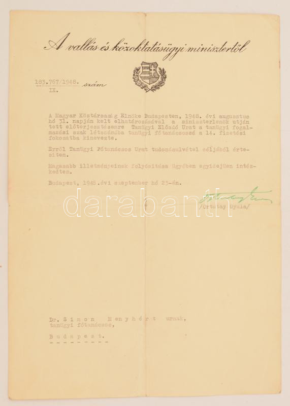 1948 Budapest, Ortutay Gyula vallás- és közoktatásügyi miniszter által Dr. Simon Menyhért tanügyi főtanácsosnak küldött kinevezési okmány. Hajtott, Ortutay Gyula aláírásával