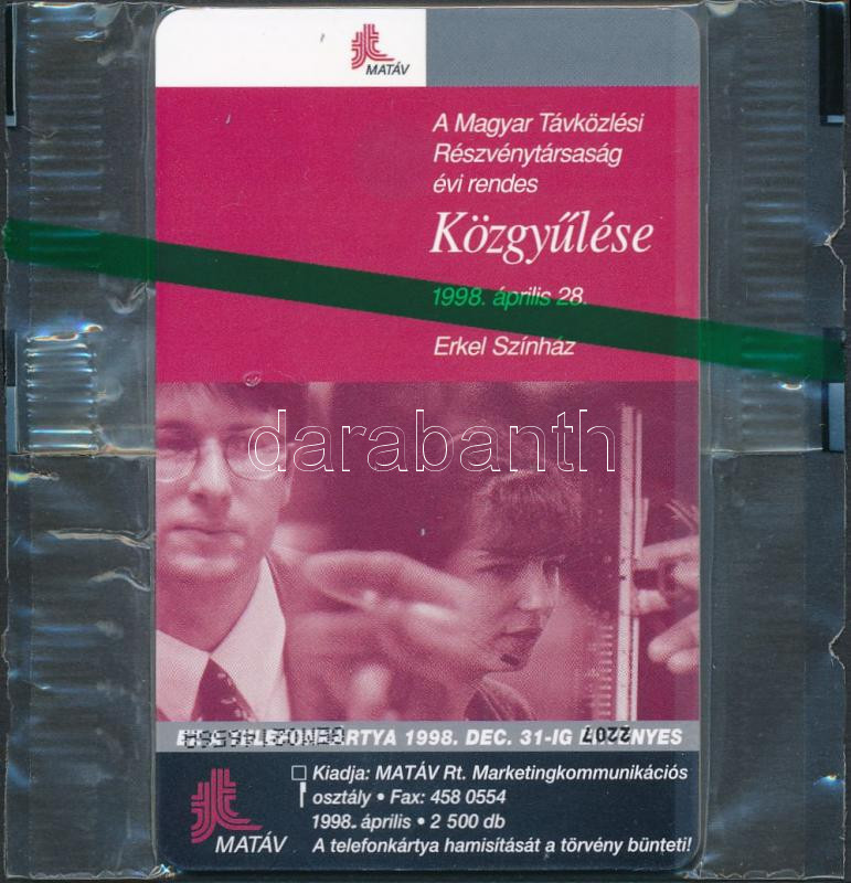 1998 MATÁV közgyűlés motívumos telefonkártya, bontatlan csomagolásban https://www.darabanth.com/de/275-Fernauktion/275.0/Andere-Sammelgebiete/Telefonkarte~200244/1998-MATAV-kozgyules-motivumos-telefonkartya-bontatlan-csomagolasban~II1402807