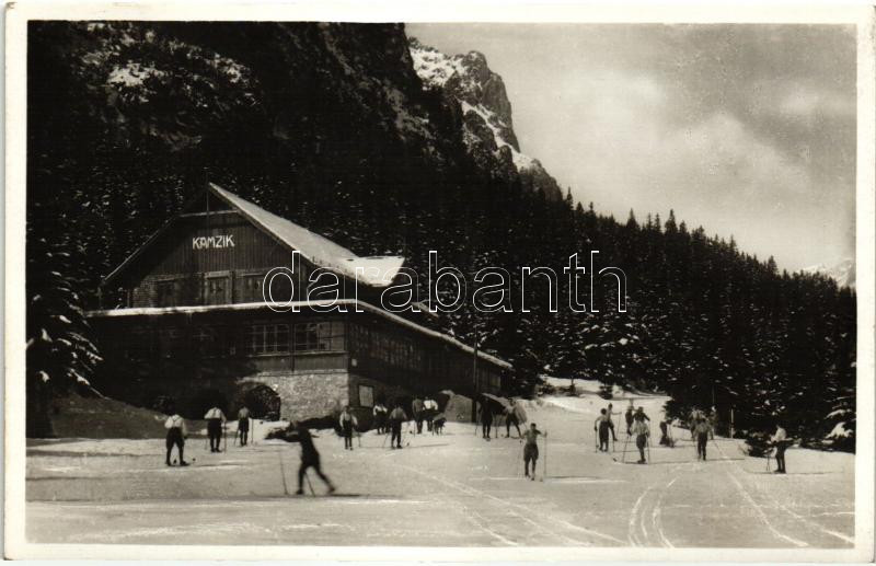 Beschreibung: Tátra, Magas Tátra, Vysoké Tatry; Hotel Kamzík, kiadja E. Nagy / hotel, skiers