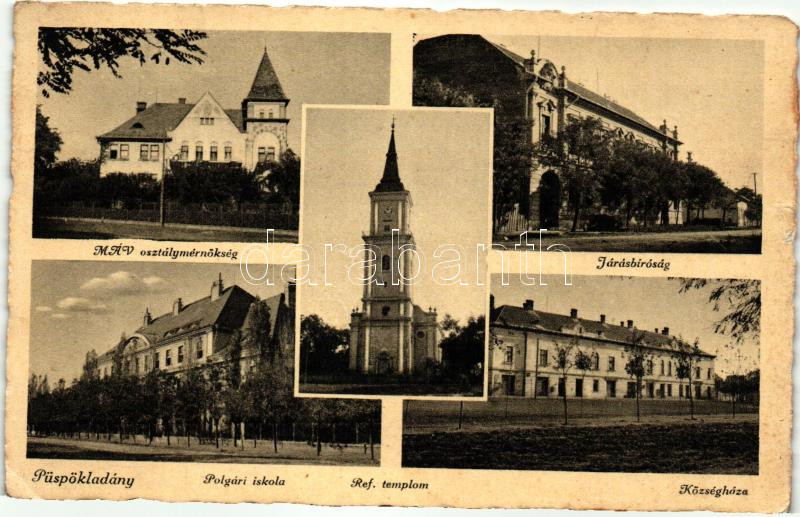 Püspökladány, MÁV osztálymérnökség, Járásbíróság, Polgári iskola, Refo... https://www.darabanth.com/de/275-Fernauktion/275.0/Ansichtskarten/Ungarn~400010/Puspokladany-MAV-osztalymernokseg-Jarasbirosag-Polgari-iskola-Reformatus-templom-~II1407610