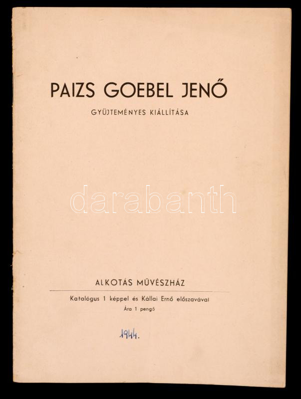 Kállai Ernő: Paizs Goebel Jenő (1896-1944) Gyűjteményes Kiállítása. Budapest, é.n. (1943), Alkotás Művészház, 10 p. Kiadói picit szakadt tűzött papírkötésben. Paizs-Goebel Jenőnek, a modern festészet jeles képviselőjének kiállítási katalógusa, amelyet az Alkotás Művészházban rendeztek a halála előtti évben, 1943-ban.