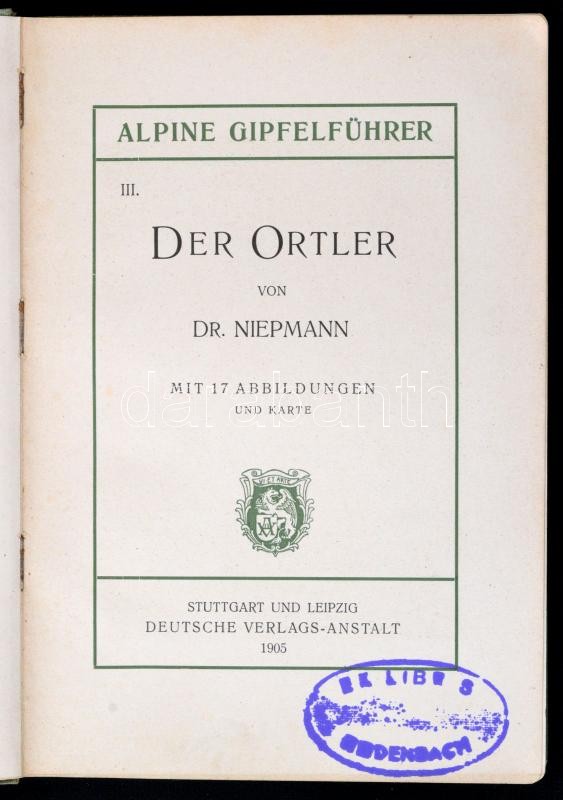 Niepmann, [Luise]: Der Ortler. Stuttgart - Lipcse, 1905, Deutsche Verlags-Anstalt (Alpine Gipfelführer 3.). Szövegközti térképpel, fekete-fehér fényképekkel. Kicsit kopott vászonkötésben, egyébként jó állapotban.