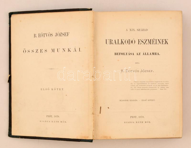 B. Eötvös József: A XIX. század uralkodó eszméinek befolyása az államra I. B. Eötvös József összes munkái I. Pest, 1870, Ráth Mór, 538 p. Második kiadás. Átkötött félvászon kötés.