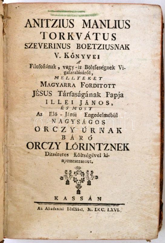 Beschreibung: Boetzius: Anitzius Manlius Torkvátus Szeverinus - - V. Könyvei a' Filosofiának, vagy-is Böltseségnek Vigasztalásáról, mellyeket Magyarra forditott Jésus Társaságának Papja Illei János és most az elö-járói engedelmébül nagyságos Orczy úrnak báró Orczy Lőrintznek ditséretes költségével ki-nyomtattatott.Kassa, 1766. Az Academiai Bötükkel. Kopott egészbőr kötésben