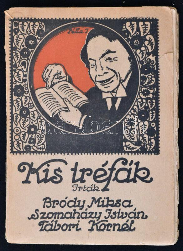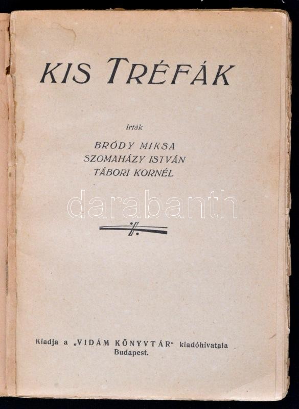 Bródy Miksa, Szomaházy István, Tábori Kornél: Kis Tréfák. Budapest, én., Vidám Könyvtár. Kiadói papírkötés. Megviselt állapotban. Az elülső borítója leszakadt a könyvtestről. A lapok foltosak.