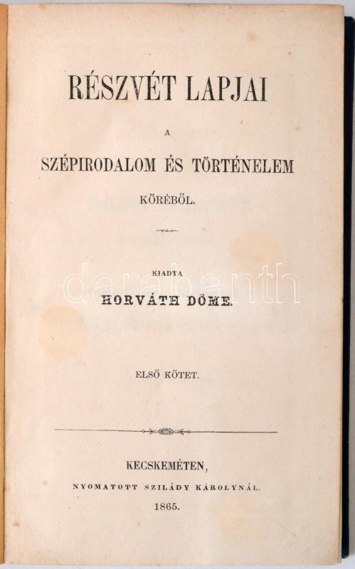 Horváth Béla: Részvét lapjai a szépirodalom és történelem köréből. Kiadta Horváth Döme. Kecskemét, 1865, Szilády Károly. Szecessziós kiadói egészvászon kötésben.