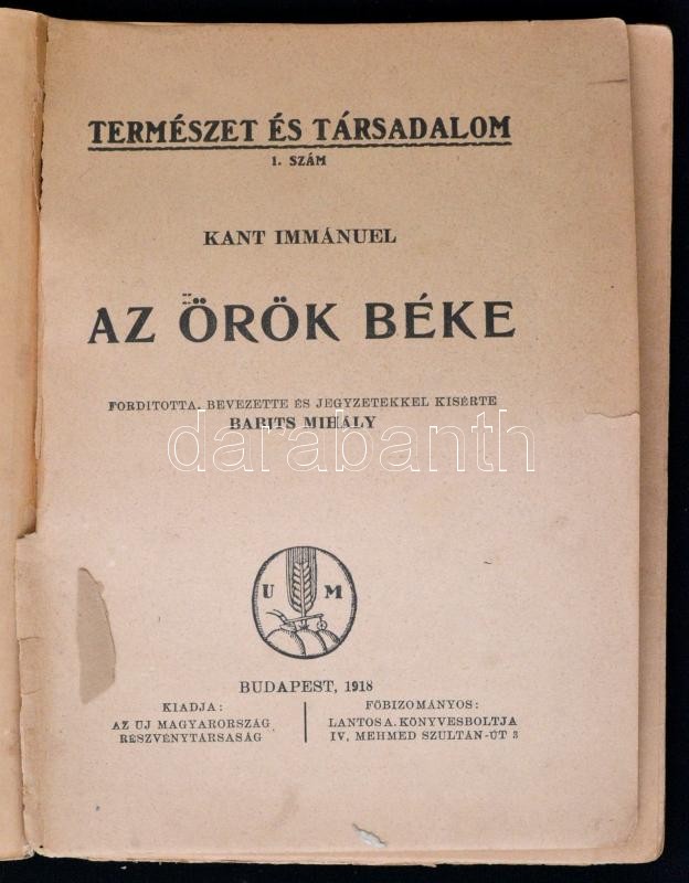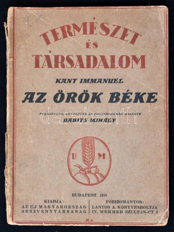 Kant Immanuel: Az örök béke. Fordította, bevezette és jegyzettekkel kísérte Babits Mihály. Természet és Társadalom 1. Budapest, 1918, Új Magyarország Részvénytársaság, 103 p. Kiadói papírkötés. A borítója szakadozott.