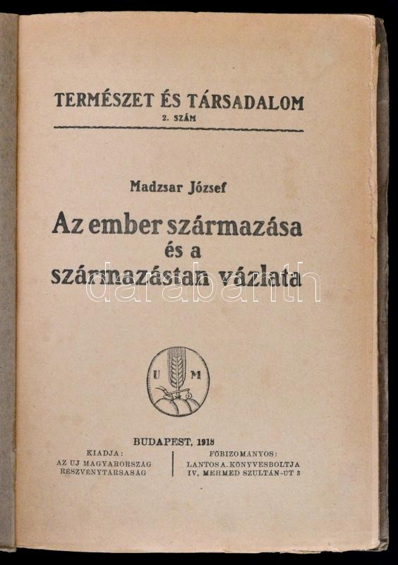 Madzsar József: Az ember származás és a származástan vázlata. Természet és Társadalom 2. Budapest, 1918, Új Magyarország Részvénytársaság, 95p. Kiadói papírkötés. Felvágatlan példány.