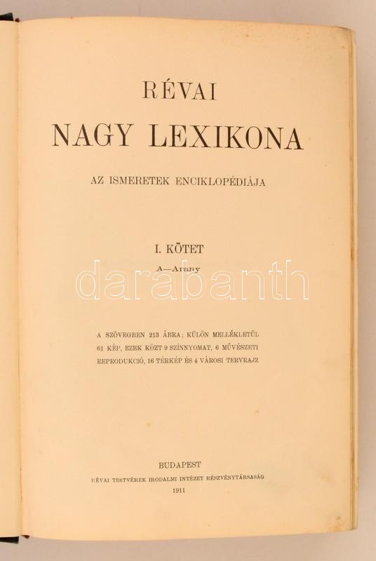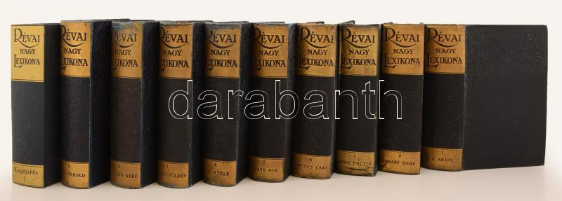 Révai Nagy Lexikona I-IX.+ Kiegészítő I. kötet. (A Kiegészítő I. kötet reprint kiadás. Budapest, 1994, Jazz Kiadó. Kiadói egészvászon kötés.) Budapest, 1911-1913, Révai Testvérek Irodalmi Intézet Rt. Kiadói, egységes, gerincén aranyozott vászonkötésben, az elülső táblán vaknyomásos díszítéssel. Változó, többnyire picit kopottas állapotban.