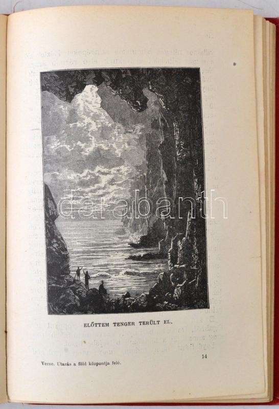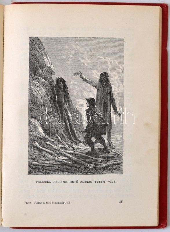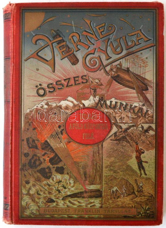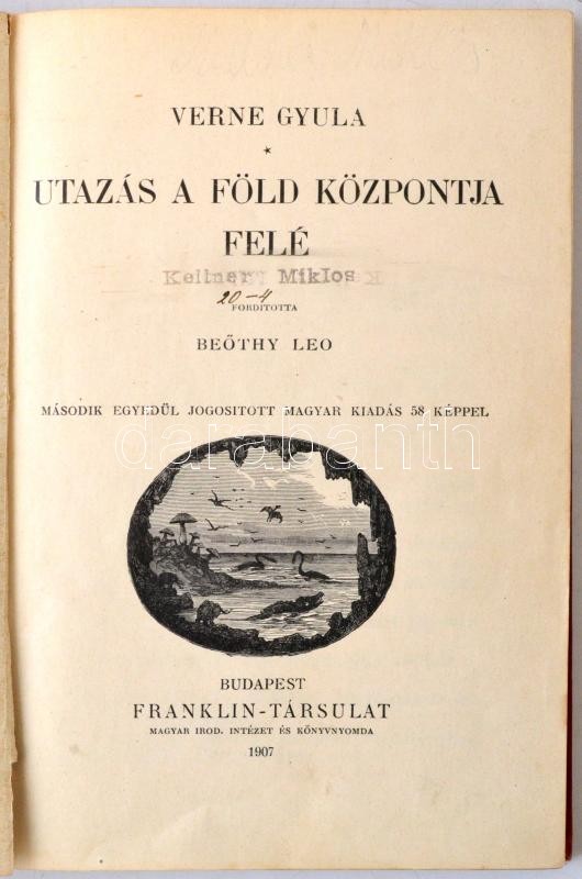 Verne Gyula: Utazás a Föld központja felé. Fordította Beőthy Leo. Budapest, 1907, Franklin-Társulat, 336p. Második kiadás. Kiadói illusztrált, aranyozott, festett egészvászon kötés, márványozott lapélekkel, egész oldalas fekete-fehér illusztrációkkal. A borítója kopottas, a kötése laza. Az elülső kötéstábla belsején címke nyomaival. A címlapon tulajdonosi névbélyegzővel. Egy-két lap foltos.