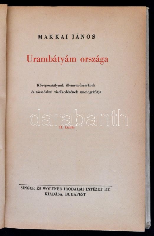 Makkai János: Urambátyám országa. Középosztályunk illemrendszerének és társadalmi viselkedésének szociológiája. Bp., é. n., Singer és Wolfner. Kissé kopott félvászon kötésben, kicsit sérült papír védőborítóval, egyébként jó állapotban.