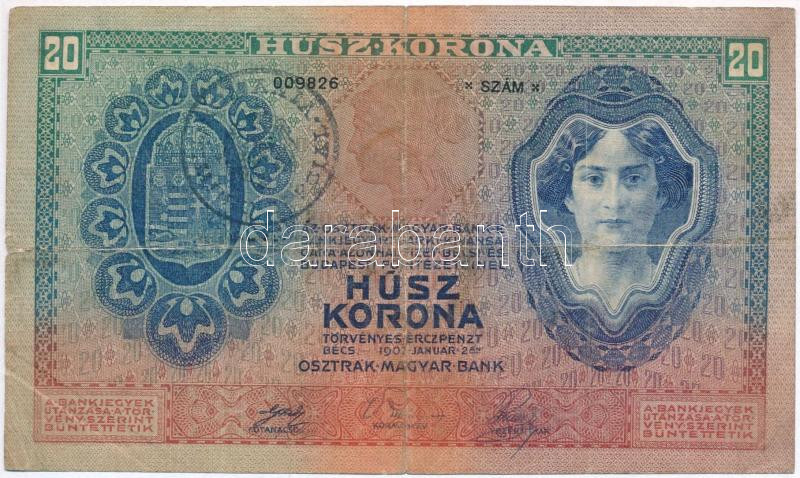 Adamo K16 https://www.darabanth.com/de/275-Fernauktion/275.0/Numismatik/Ungarische-Banknoten~300007/1907-20K-roman-felulbelyegzessel-TIII---Adamo-K16~II1402971
