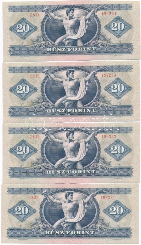 1975. 20Ft (4x) sorszámkövetők T:I-,II https://www.darabanth.com/de/275-Fernauktion/275.0/Numismatik/Ungarische-Banknoten~300007/1975-20Ft-4x-sorszamkovetok-TI-II~II1408054