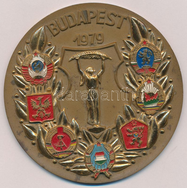 1979. "Budapest 1979" részben aranyozott és zománcozott Br emlékplaket... https://www.darabanth.com/de/275-Fernauktion/275.0/Numismatik/Ungarische-Gedenkmunzen-Plaketten~300009/1979-Budapest-1979-reszben-aranyozott-es-zomancozott-Br-emlekplakett-80mm-T2~II1404784