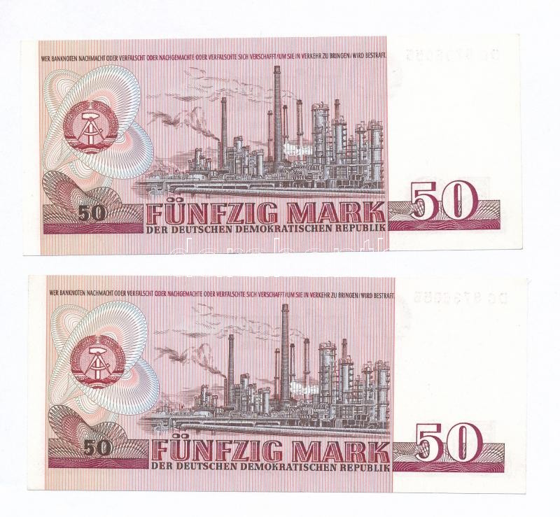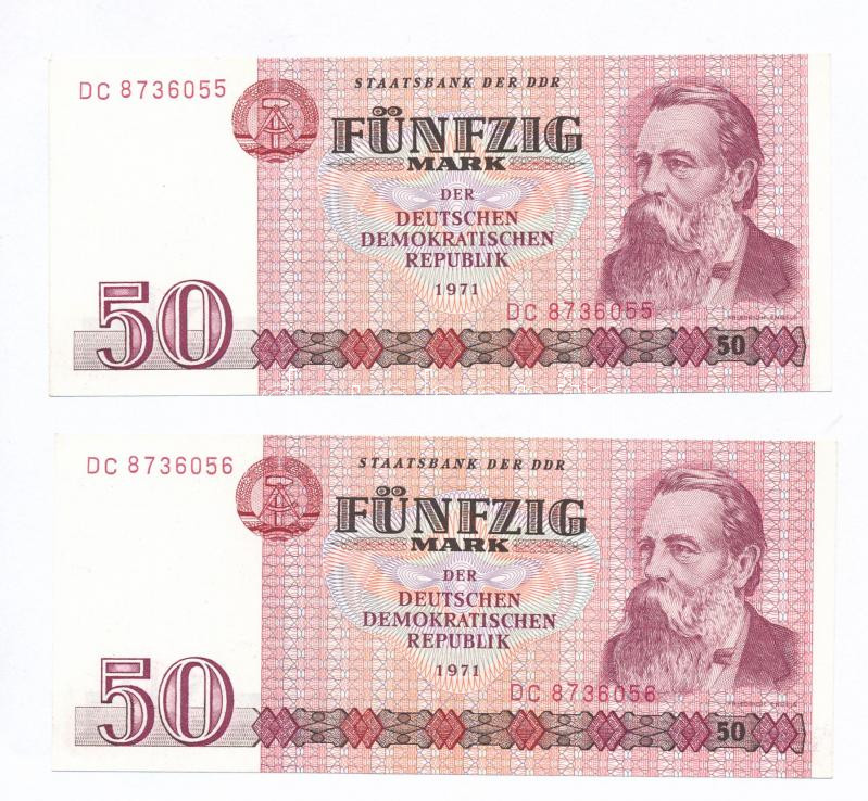 GDR 1971. 50 Mark (2x) sequenti... https://www.darabanth.com/de/275-Fernauktion/275.0/Numismatik/Weltweit-Banknoten~300012/NDK-1971-50M-2x-sorszamkovetok-TI--GDR-1971-50-Mark-2x-sequential-serials-CUNC--Krause-30~II1402391