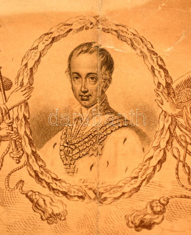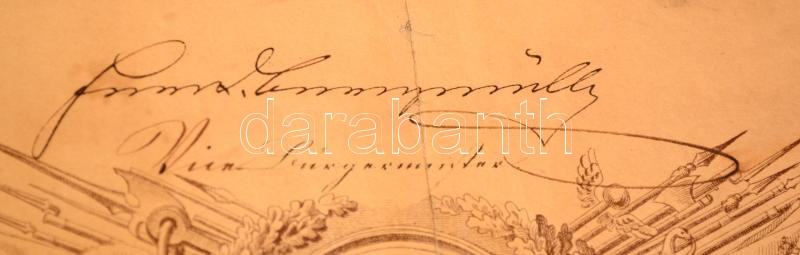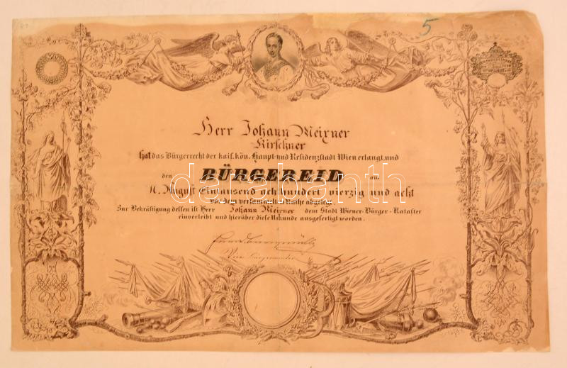 1848 Bécs, polgárjogot adományozó dekoratív rézmetszetes oklevél, a polgármester aláírásával és Ferenc császár arcképével / Wien, Bürgerreid. Vienna city, illustrated awarding letter of civil rights, signed, 26×41 cm