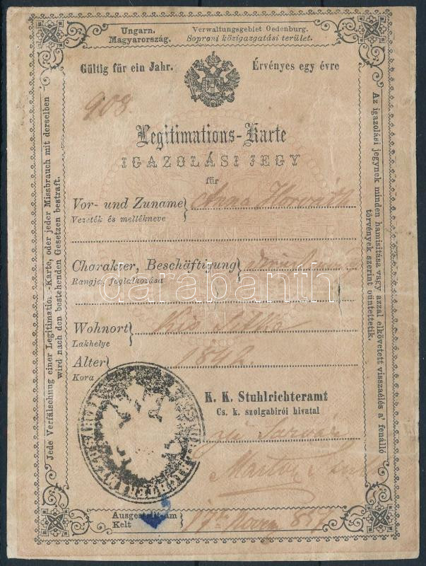 1857 A szolgabírói hivatal igazolási jegye Horváth Anna sárvári lakos ... https://www.darabanth.com/de/276-Fernauktion/276.0/Andere-Sammelgebiete/Dokument~200017/1857-A-szolgabiroi-hivatal-igazolasi-jegye-Horvath-Anna-sarvari-lakos-reszere-ID~II1415384
