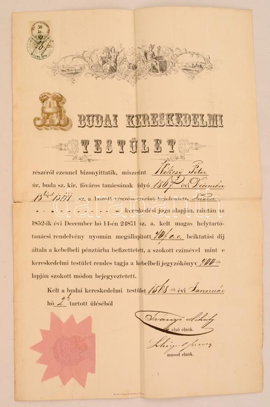 1868 A Budai Kereskedelmi Testület által kiadott tagsági igazolás fűsz... https://www.darabanth.com/de/276-Fernauktion/276.0/Andere-Sammelgebiete/Dokument~200017/1868-A-Budai-Kereskedelmi-Testulet-altal-kiadott-tagsagi-igazolas-fuszerkereskedo-szamara-o~II1415368