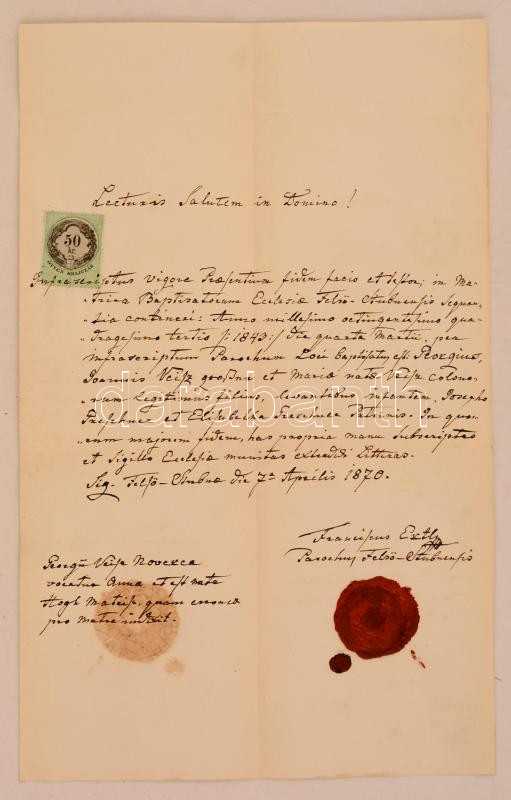 Beschreibung: 1870 Felsőstubnya, keresztelési anyakönyvi kivonat latin nyelven, viaszpecséttel, 50 kr okmánybélyeggel