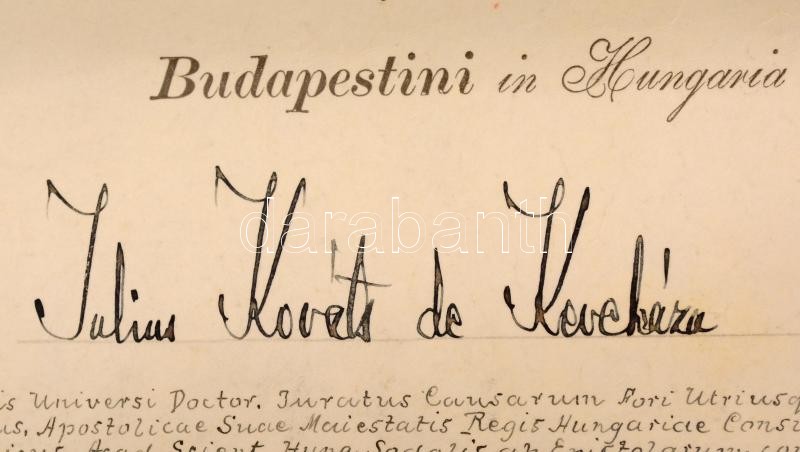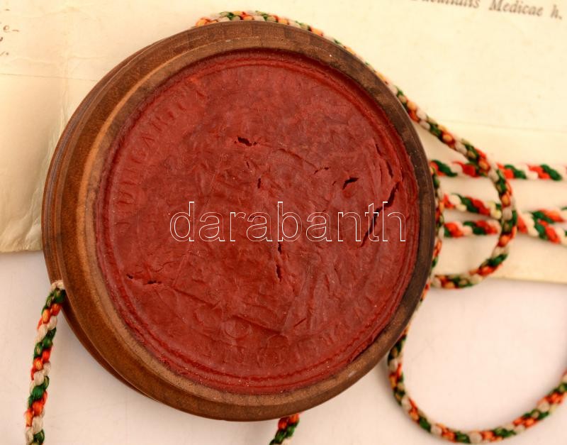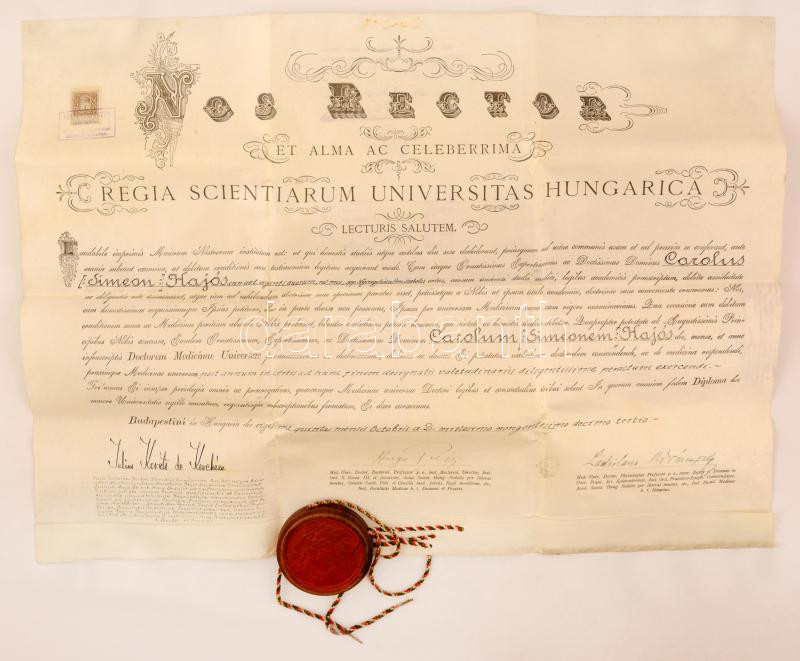 1913 Hajós Károly (1891-1976) belgyógyász allergológus, nemzetközi tüdő-asztma kutató, orvos doktori diplomája, Keveházi Kováts Gyulának (1849-1935) az egyetem rektorának, valamint Preisz Hugónak (1860-1940), orvos, állatorvos, bakterológus,intézményvezető, tanszékvezető egyetemi tanár, későbbi egyetemi rektornak és Udránszky Lászlónak (1862-1914) az egyetem tanárának az aláírásaival, okmánybélyeggel, pecsétekkel, fatokos függő pecséttel, a fa tok egyik része hiányzik, a viaszon némi sérülés.