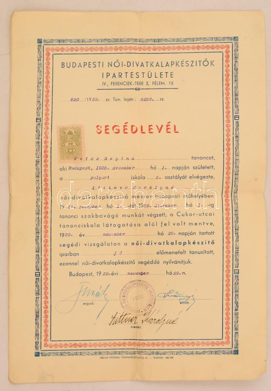 1939 Budapesti Női-Divatkalapkészítők Ipartestületének segédlevele, al... https://www.darabanth.com/de/276-Fernauktion/276.0/Andere-Sammelgebiete/Dokument~200017/1939-Budapesti-Noi-Divatkalapkeszitok-Ipartestuletenek-segedlevele-alairasokkal-okmanyb~II1409053