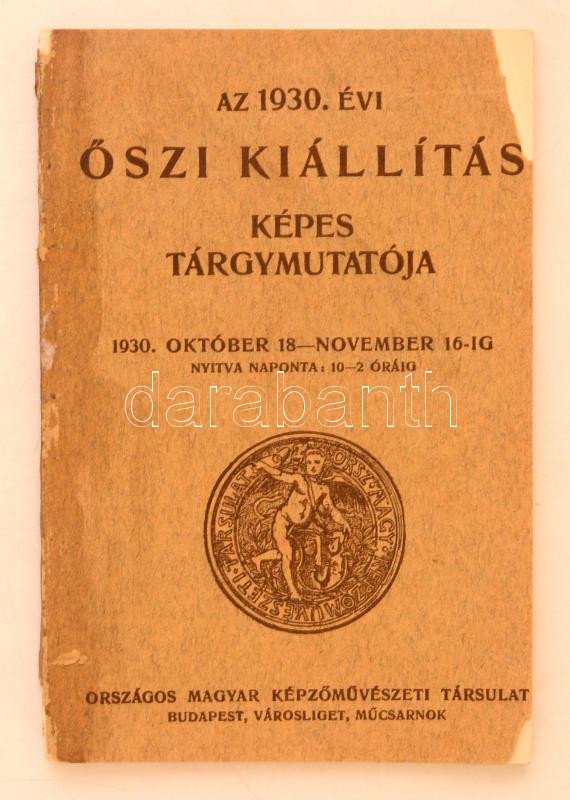 1930 Az 1930. évi Őszi kiállítás képes tárgymutatója. Budapest, Országos Magyar Képzőművészet Társulat. Kiadói papírkötés, fekete-fehér fotókkal illusztrált kiadvány. Ipolyi Arnold gyűjteménye, Pásztor János összes művei, Aradi Edvi Illés, Horváth Béla, Kampis János, Knopp Imre, Maróthi Major Jenő, Sárdy Brutus, és Zombory Lajos műveinek kiállítása.