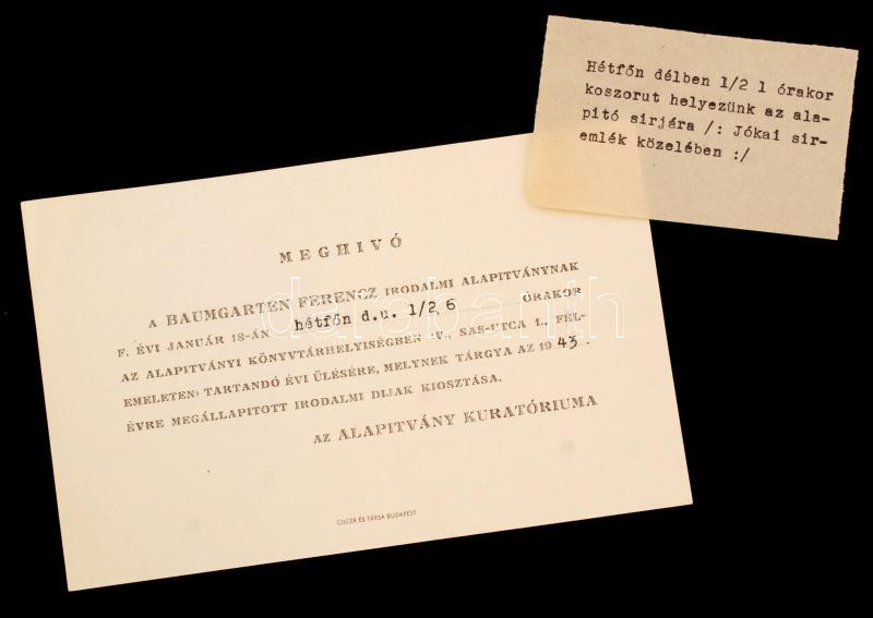 1943 Meghívó a Baumgarten díj díjkiosztó ünnepségére. Az évben díjazottak voltak: Asztalos István, Bóka László, Fodor József, Jankovich Ferenc, Révay József, Tamási Áron