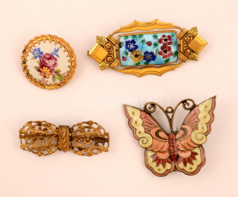 Beschreibung: 4 db különféle dekoratív bross, köztük porcelán és tűzzománc díszítésű is, különböző méretben