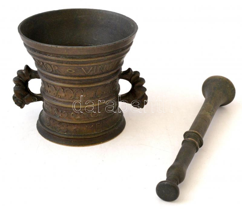 Beschreibung: Bronz mozsár, replika, "Amor vincit omnia 1771" és "Spes mea in Deo" felirattal, törővel d: 12 cm, m: 11 cm, h: 20,5 cm (törő)