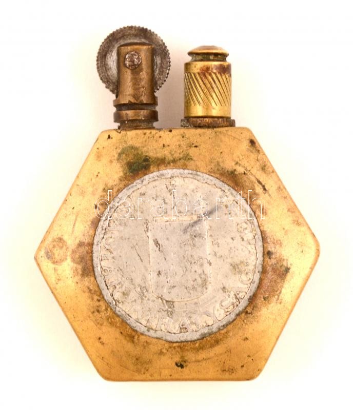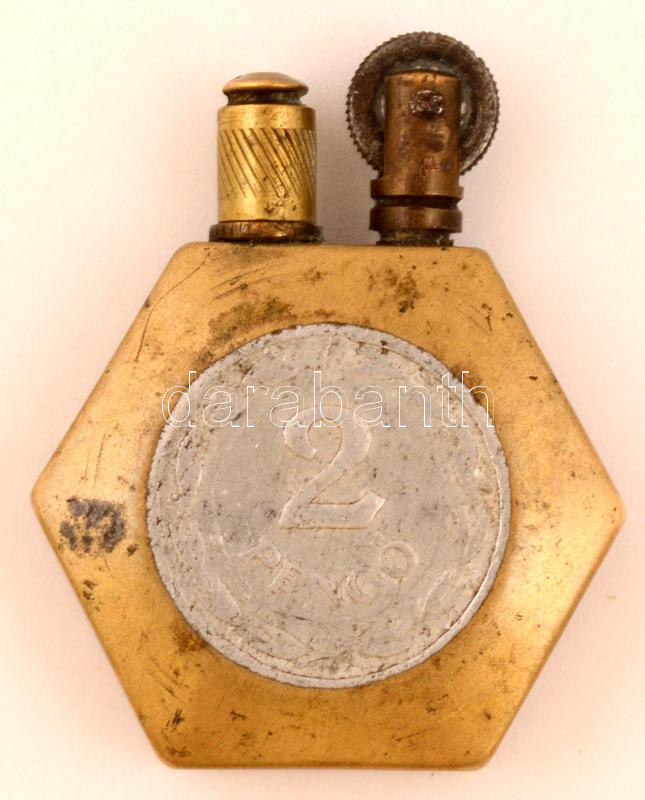 Beschreibung: Két pengős érmével díszített réz öngyújtó