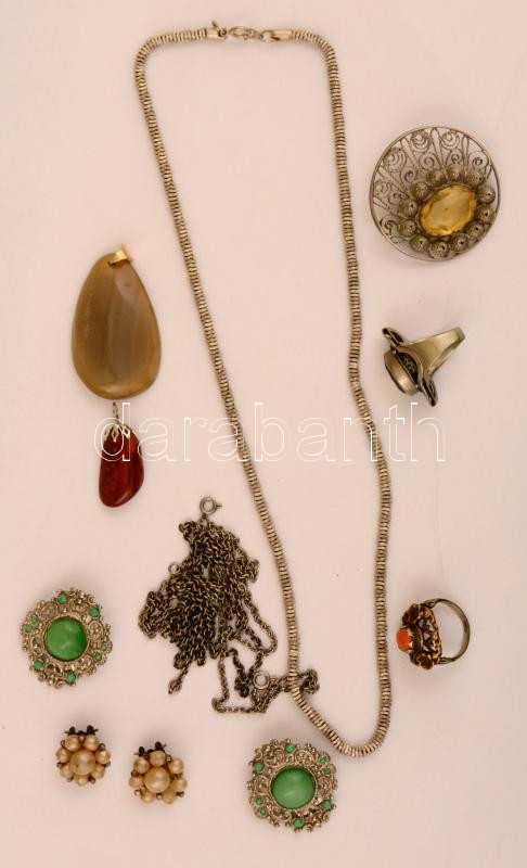 Beschreibung: Kis bizsu tétel, gyűrűvel, medállal, brossal, lánccal, fülklipsszel, 12 db