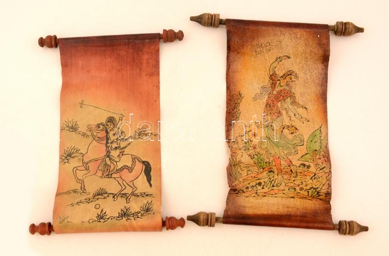 Beschreibung: Közel-keleti bőr fali dísz, 2 db, fa merevítésekkel, az egyik hátán pecséttel, és a szélén némi sérülésekkel, 41x18 cm.,36x18 cm.