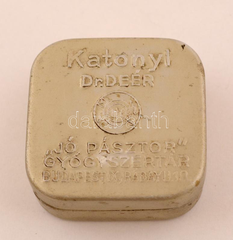 Régi gyógyszeres fém dobozka, "Katonyi Dr. Deér" felirattal, 3×3 cm https://www.darabanth.com/de/276-Fernauktion/276.0/Andere-Sammelgebiete/Flohmarkt~200044/Regi-gyogyszeres-fem-dobozka-Katonyi-Dr-Deer-felirattal-3C3973-cm~II1415057