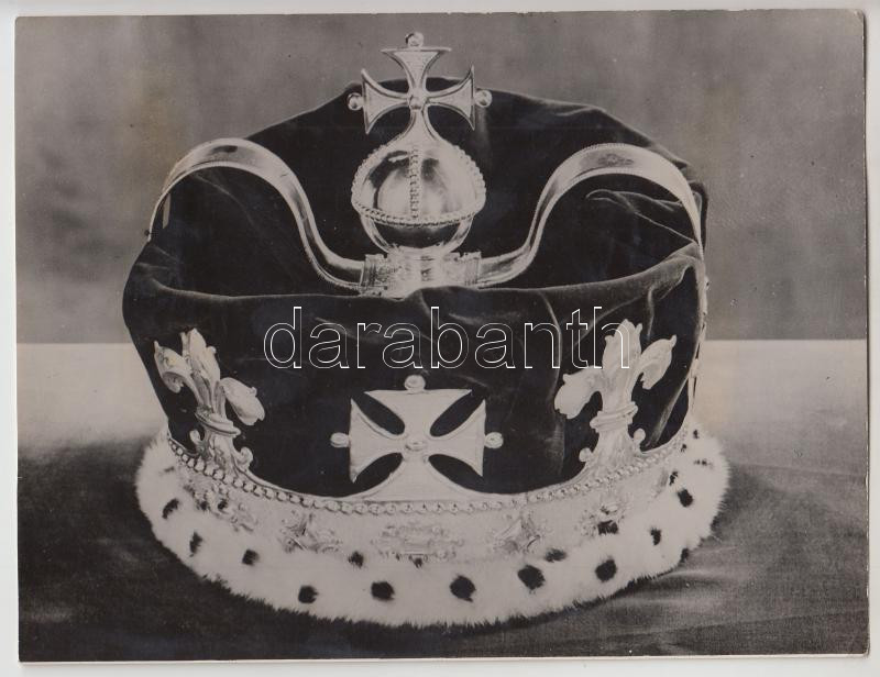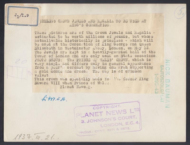 1937 A későbbi VIII. Eduárd számára készült walesi hercegi korona, VI. György és Erzsébet anyakirályné koronázása előtt készült sajtófotó (Planet News Ltd.), hátulján feliratozva, 15,5×20 cm / 1937 Coronet of the Prince of Wales, worn by King Edward VIII as Prince of Wales, press photograph (Planet News Ltd.), taken before the coronation of King George VI and Queen Elizabeth the Queen Mother, with notes on its back, 15,5×20 cm