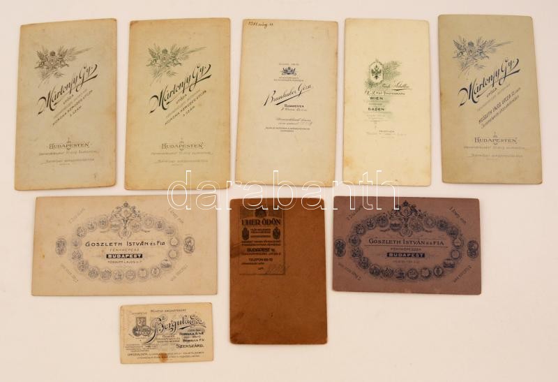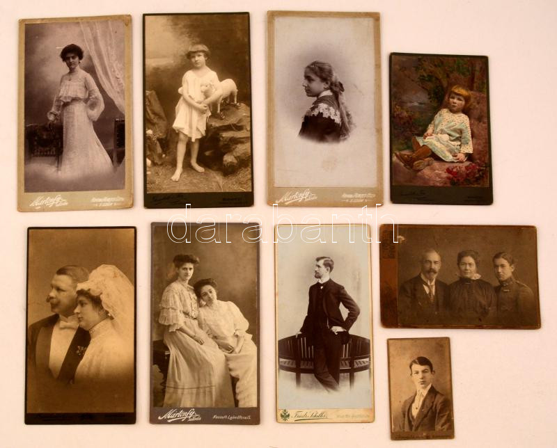 cca 1900-1910 Keményhátú női, férfi, és gyermek portré és családi fotók, 9 db, köztük színezett műtermi fotókkal, Borgula Ede (Szekszárd), Friedr. Schiller (Bécs), Bunhuber Géza (Budapest), Uher Ödön (Budapest), Mártonfy Gy. (Budapest), Goszleth István és Fia (Budapest), 21x12 cm. és 10x6 cm. közötti méretben.