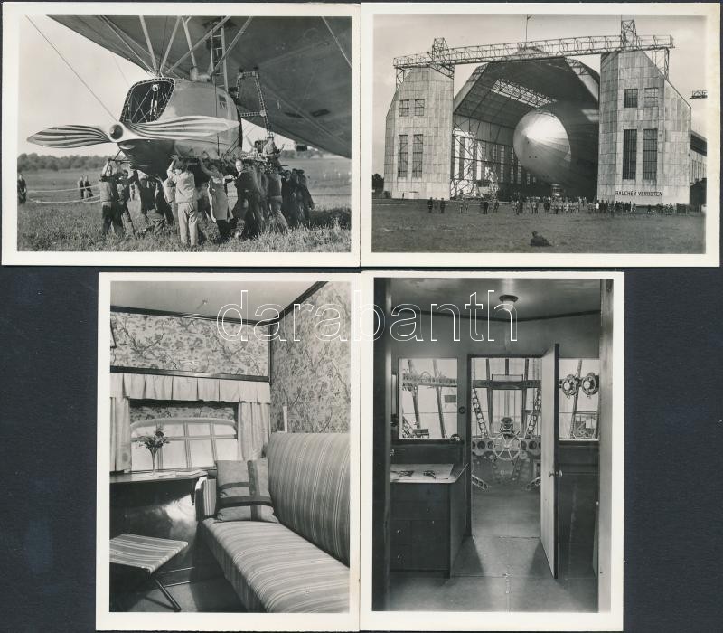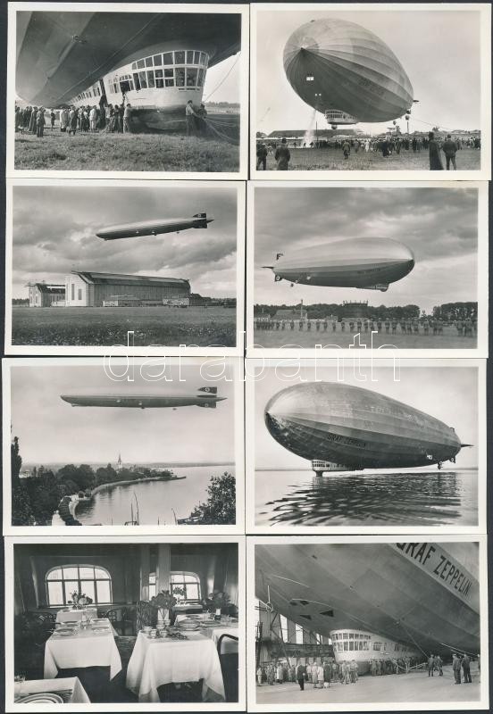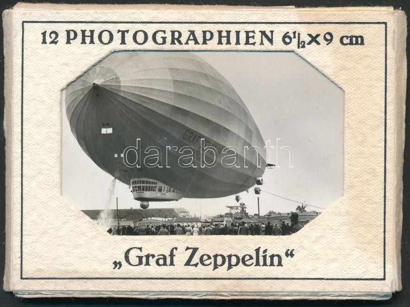 cca 1930 12 db hátoldalán nyomtatva feliratozott fotó a Graf Zeppelin léghajóról, eredeti papírtokjában / series of photos of the German Graf Zeppelin airship in paper case, 6.5×9 cm