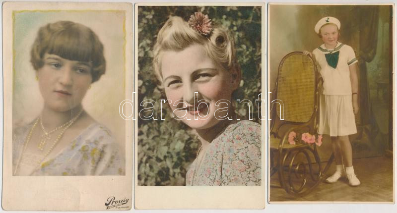 cca 1944 Színezett műtermi portréfotók, 3 db fotólap, 14x9 cm https://www.darabanth.com/de/276-Fernauktion/276.0/Andere-Sammelgebiete/Foto~200020/cca-1944-Szinezett-mutermi-portrefotok-3-db-fotolap-14x9-cm~II1413110