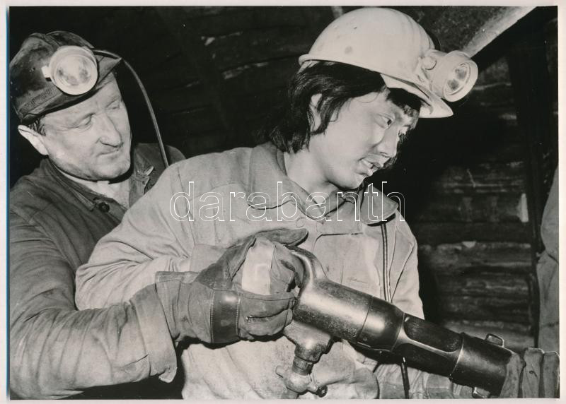 Beschreibung: cca 1978 Komló, a Mecseki Szénbányáknál mongol fiatalok ismerkednek a vájár szakmával, vintage fotó, 16,5x23 cm
