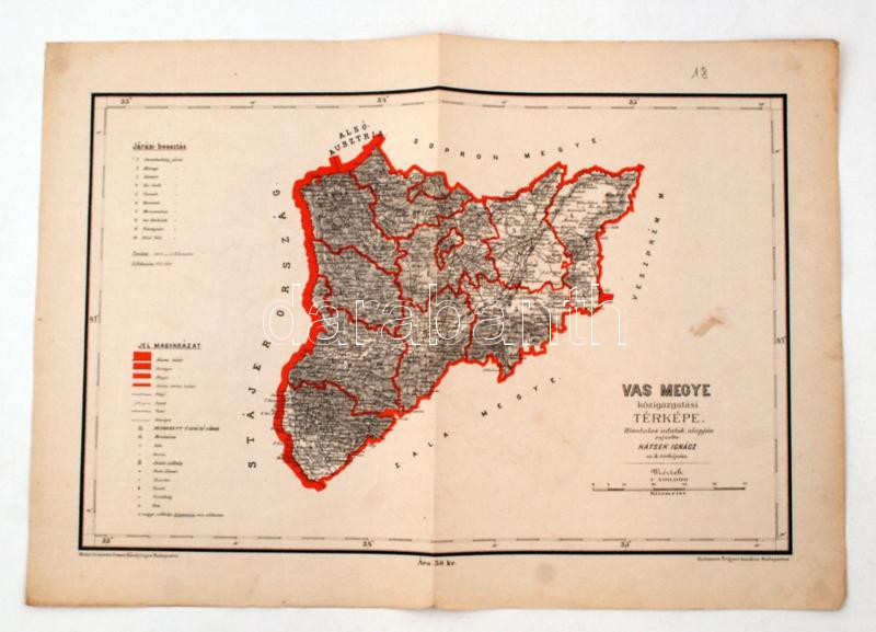 1880 Vas megye közigazgatási térképe. Hátsek Ignác - A magyar szent korona országainak megyei térképei. Rajzolta Hátsek Ignácz. Budapest, 1880. Rautmann Frigyes Kiadó Hivatala Posner Károly Lajos. Határszínezett kőnyomat,kis hibával a széleken, 38x54cm