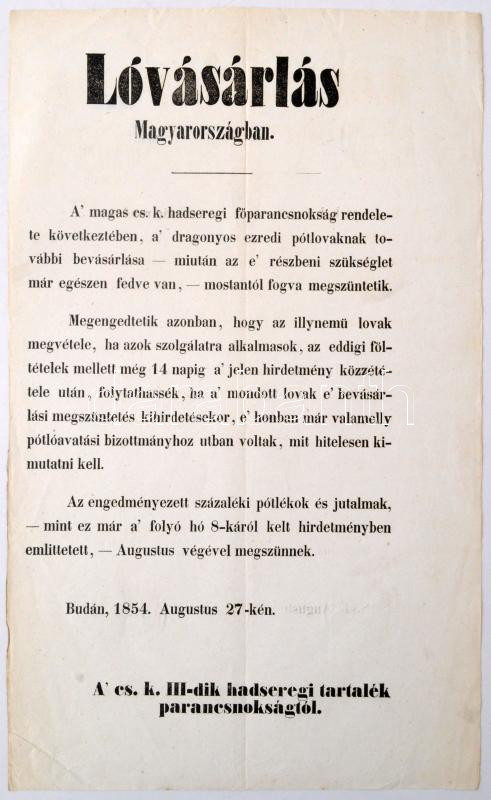 Beschreibung: 1854 Lóvásárlás Magyarországban, A' cs. k. III-dik hadseregi tartalék parancsnokságtól, Budán, magyar nyelven, jó állapotú, 35x21cm