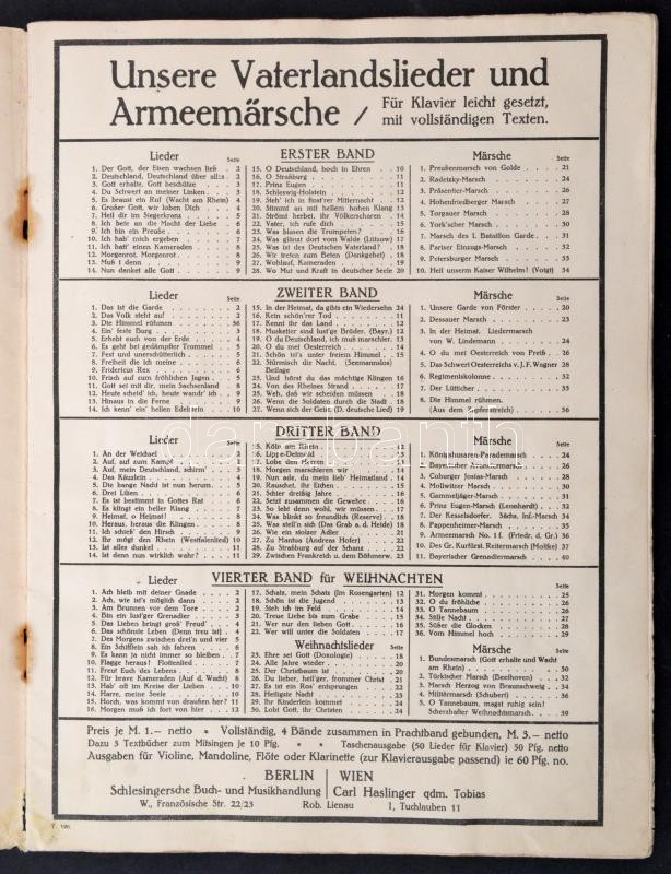 1914 Vaterlandslieder und Armeemärsche. Vol. 4.: für Weihnachten. Berlin - Wien, Schlesingersche Buch- und Musikhandlung - Carl Haslinger quondam Tobias. Military marches for Christmas in German. Paperback, the covers get off, otherwise in good condition.