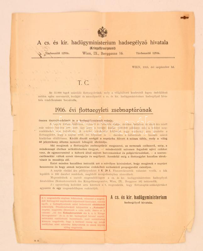 Beschreibung: 1915 Bécs, A cs. és kir. hadügyminisztérium hadsegélyező hivatalának felhívása a flottaegyleti zsebnaptár megvásárlására jótékonysági okokból